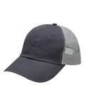 Adams Vibe Meshback Cap. 100% Cotton Midweight twill crown and visor. Heavy enzyme wash. Pre-curved visor. Dyed to match snap back closure, self fabric matching color sweatband. Seam tape matches the mesh back.
