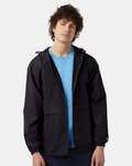 CHMPN ADT ANORAK ZIP JACKET. 2.8 oz., 100% polyester micro poplin Wind-and water-resistant Scuba collar with hood Adjustable bungie drawcord at hood and bottom hem Exposed dyed to match nylon coil zipper Lower front on seam pockets Set-in sleeves Encased elastic cuffs Champion C patch on left sleeve Woven neck label